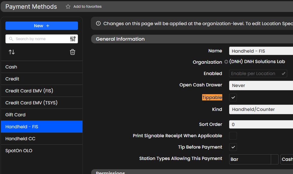 a) Payment Methods make sure payment type is "Tippable" is on for each order type and add the suggested tip percentages also for each order type.
